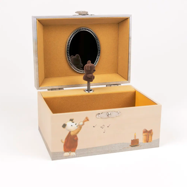 - Αντί για την κλασική μπαλαρίνα, ένα χαριτωμένο αρκουδάκι στριφογυρίζει στον ρυθμό της μουσικής – μια υπέροχη έκπληξη για μικρούς φίλους των ζώων.