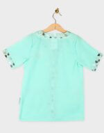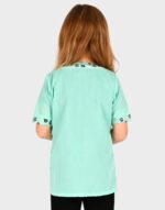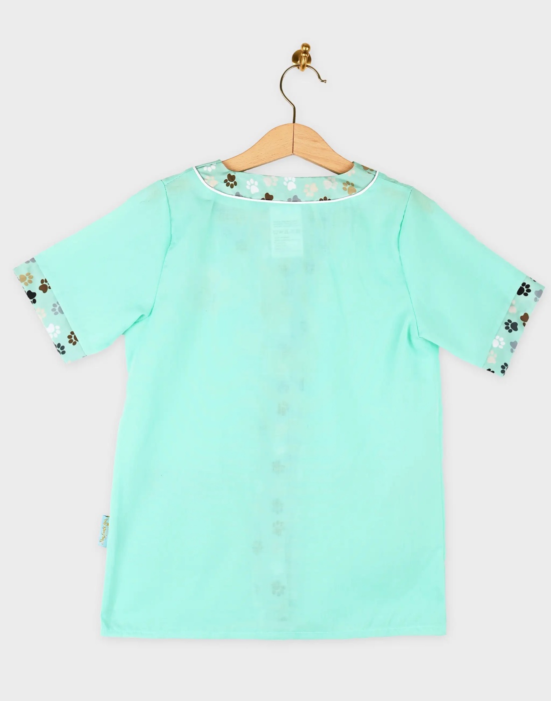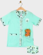 Η στολή είναι σε απαλό πράσινο χρώμα με διακοσμητικές λεπτομέρειες πατουσών