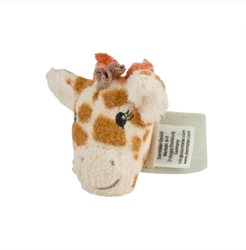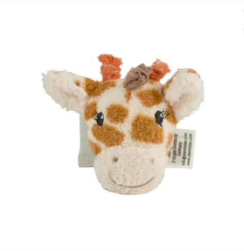 Υφασμάτινη κουδουνίστρα καρπού σε σχέδιο χαριτωμένης καμηλοπάρδαλης Kaya που διασκεδάζει και απασχολεί το μωρό.