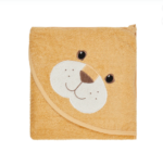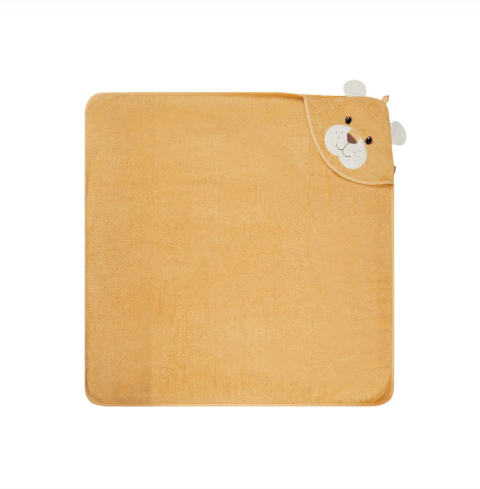 Απαλή παιδική πετσέτα μπάνιου με κουκούλα σε σχέδιο χαριτωμένου λιονταριού Leo που κρατά το παιδί ζεστό μετά το μπάνιο.