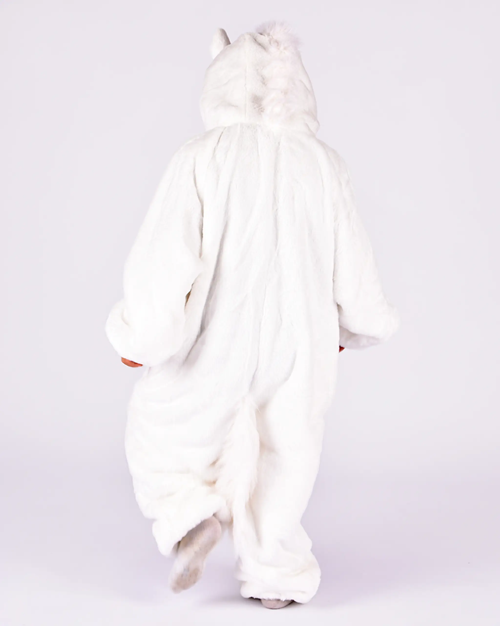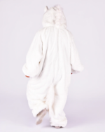 Η στολή ολοκληρώνεται με λεπτομέρειες όπως η ουρά στο πίσω μέρος και το μπροστινό κλείσιμο με φερμουάρ, που διευκολύνει την εφαρμογή και την αφαίρεση. Ο ουδέτερος λευκός χρωματισμός την καθιστά ιδανική τόσο για αγόρια όσο και για κορίτσια.