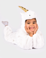 Διαθέτει ενσωματωμένη κουκούλα με χαριτωμένο πρόσωπο μονόκερου και μεταλλιζέ χρυσό κέρατο, που προσθέτει μια μαγική πινελιά στη στολή. Τα φουσκωτά μανίκια και η άνετη γραμμή εξασφαλίζουν ελευθερία κινήσεων, ενώ η απαλή υφή του υφάσματος προσφέρει αίσθηση άνεσης και ζεστασιάς.